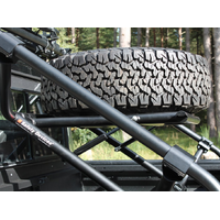 Rear load bed spare wheel carrier featuring lift-up operation powered by gas rams either side, capable of supporting a 35” tyre. Also features an adjustable length wheel centre to suit different tyres and wheel offsets. Mounts to roll cage with aluminium clamps (included) and the rear floor of the vehicle. This is only for mounting with our Safety Devices RBL1857SSS & RBL2437SSS roll cages.