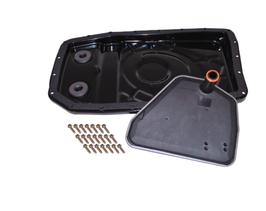 The standard part number for the transmission oil pan with built-in filter is: LR007474.
