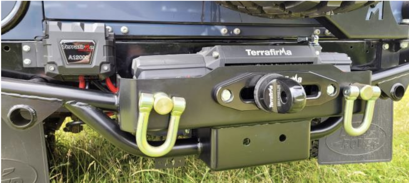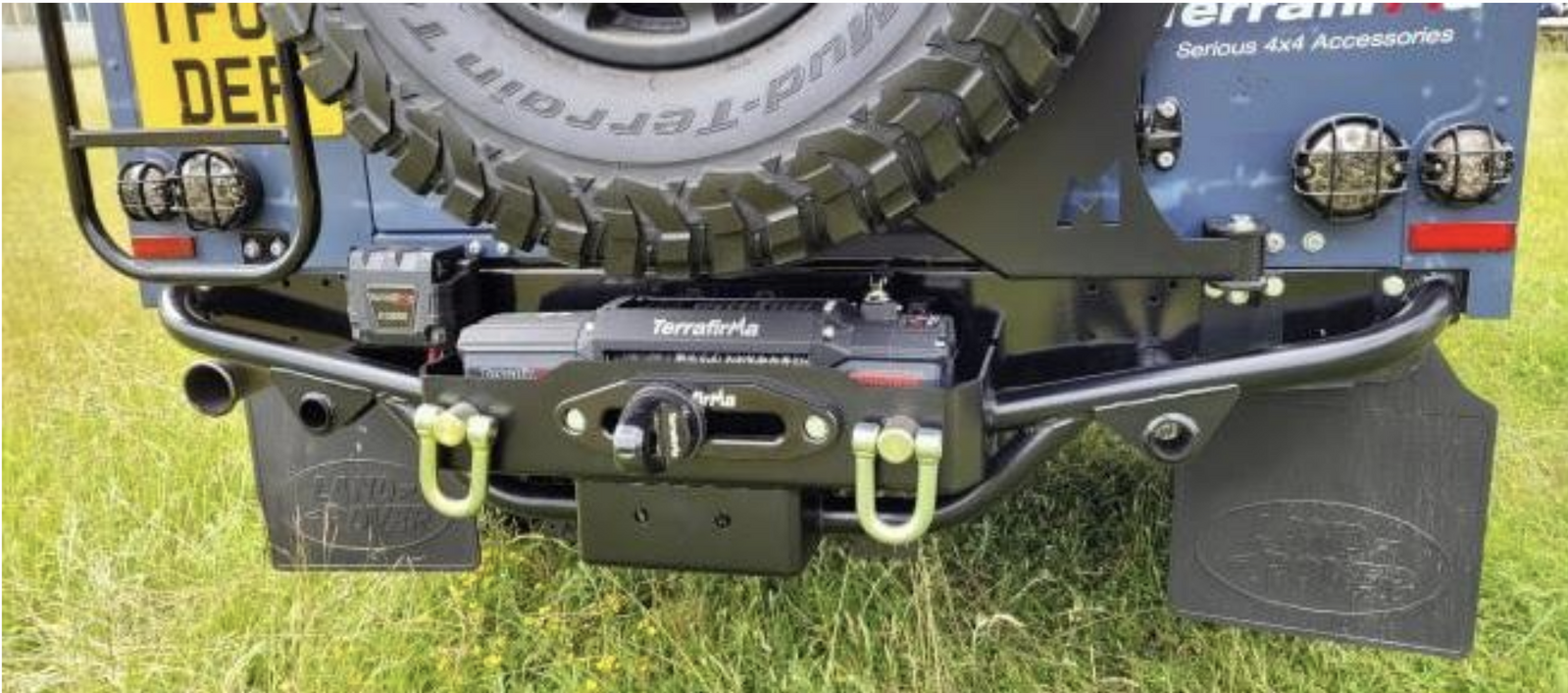 This new Terrafirma rear winch mount suits all Defenders and is based on the popular TF883 rear step tow bar and incorporates a 5mm steel winch box. The design provides the optimum clearance for the spare wheel and rear door while only marginally affecting the departure angle.